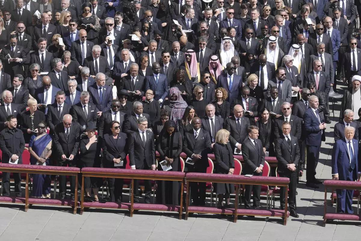 President Donald Trump, front row right, and Ukraine's President Volodymr Zelenskyy, front row left, are seen amongst other dignitaries during the funeral of Pope Francis in St. Peter's Square at the Vatican, Saturday, April 26, 2025. (AP Photo/Gregorio Borgia)
