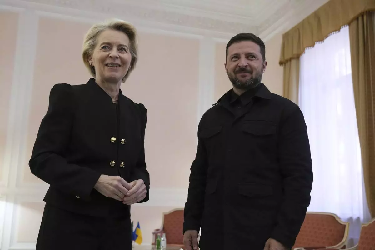 European Commission President Ursula von der Leyen, left, speaks with Ukraine's President Ukraine Volodymyr Zelenskyy prior to a bilateral meeting in Rome, Italy, Saturday April 26, 2025. (AP Photo/Andrew Medichini, Pool)