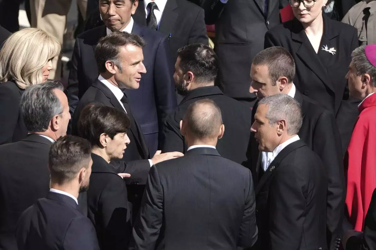 French President Emmanuel Macron, center left, speaks with Ukraine's President Volodymr Zelenskyy, center right, as they arrive for the funeral of Pope Francis in St. Peter's Square at the Vatican, Saturday, April 26, 2025. (AP Photo/Markus Schreiber)