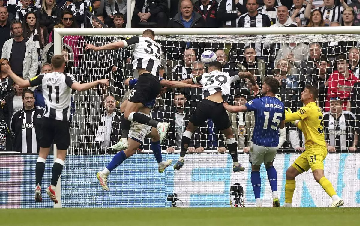 Newcastle United's Dan Burn, 33, scores during the English Premier League soccer match between Newcastle United and Ipswich Town at St James' Park, Newcastle, England, Saturday April 26, 2025. (Owen Humphreys/PA via AP)