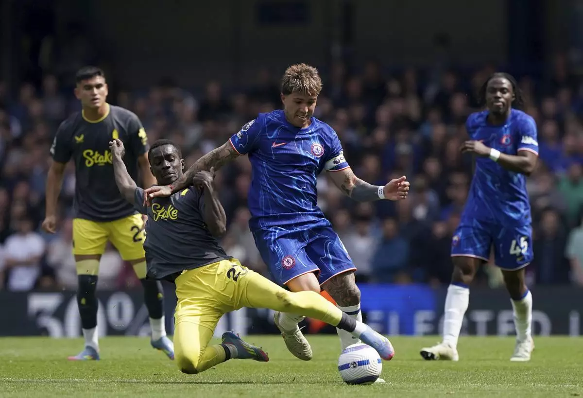 Everton's Idrissa Gueye, left, and Chelsea's Enzo Fernandez battle for the ball during the Premier League match between Chelsea and Everton at Stamford Bridge, London, Saturday April 26, 2025. (Jonathan Brady/PA via AP)