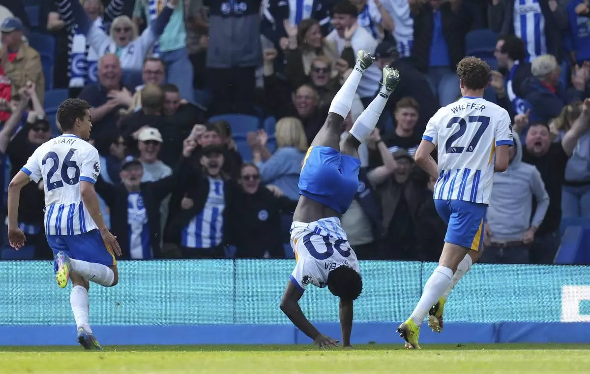 Brighton and Hove Albion's Carlos Baleba, center, celebrates scoring during the English Premier League soccer match between Brighton & Hove Albion and West Ham United at the American Express Stadium, Brighton, England, Saturday April 26, 2025. (John Walton/PA via AP)