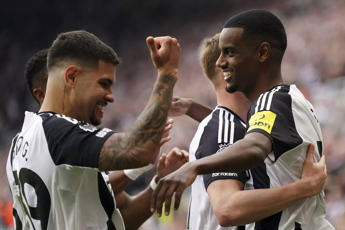 Newcastle United's Alexander Isak, right, celebrates scoring with teammates during the English Premier League soccer match between Newcastle United and Ipswich Town at St James' Park, Newcastle, England, Saturday April 26, 2025. (Owen Humphreys/PA via AP)