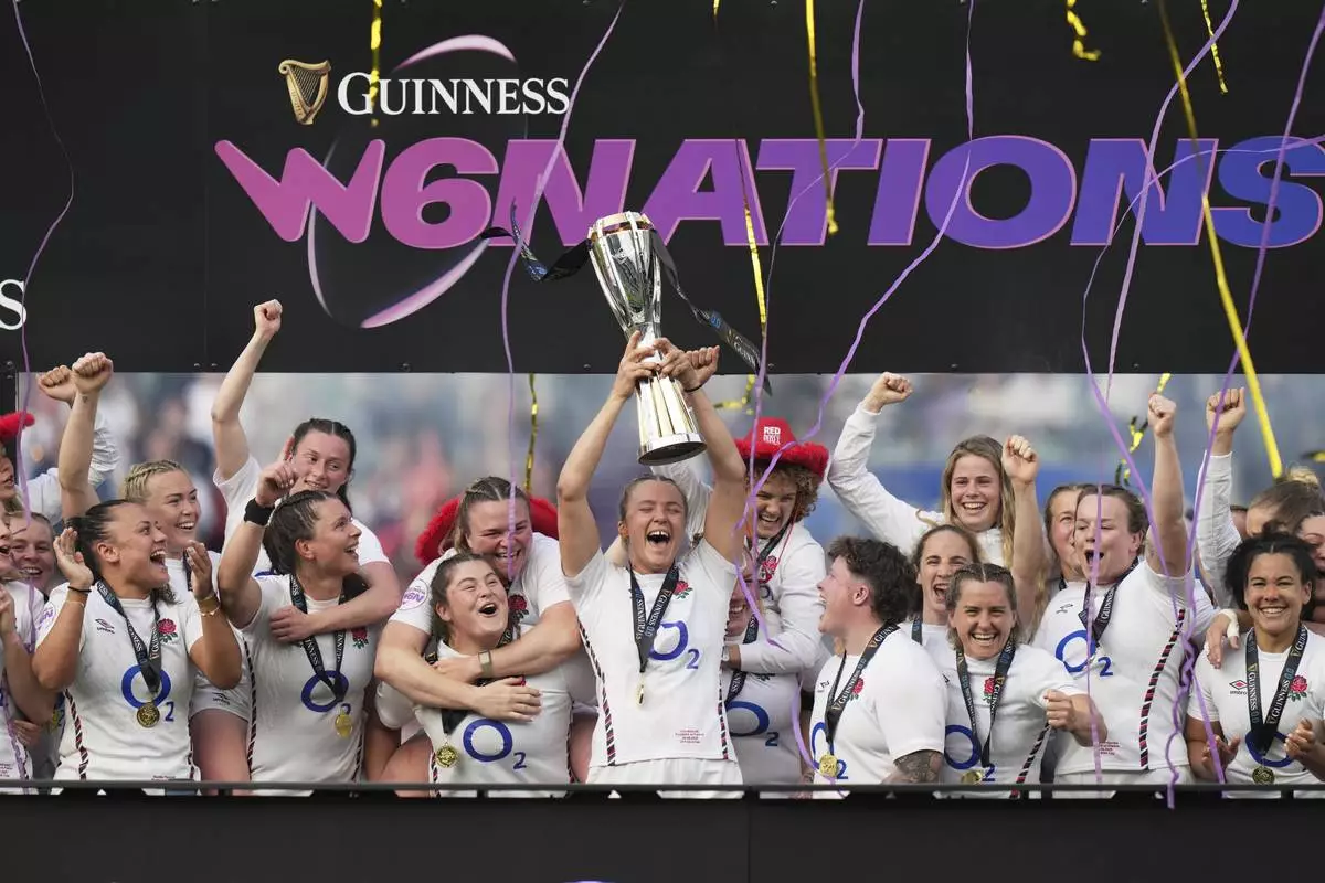 England's captain Zoe Aldcroft, centre, lifts the trophy at the presentation ceremony following the Women's Six Nations rugby union match at Twickenham stadium in London, Saturday, April 26, 2025. (AP Photo/Alastair Grant)