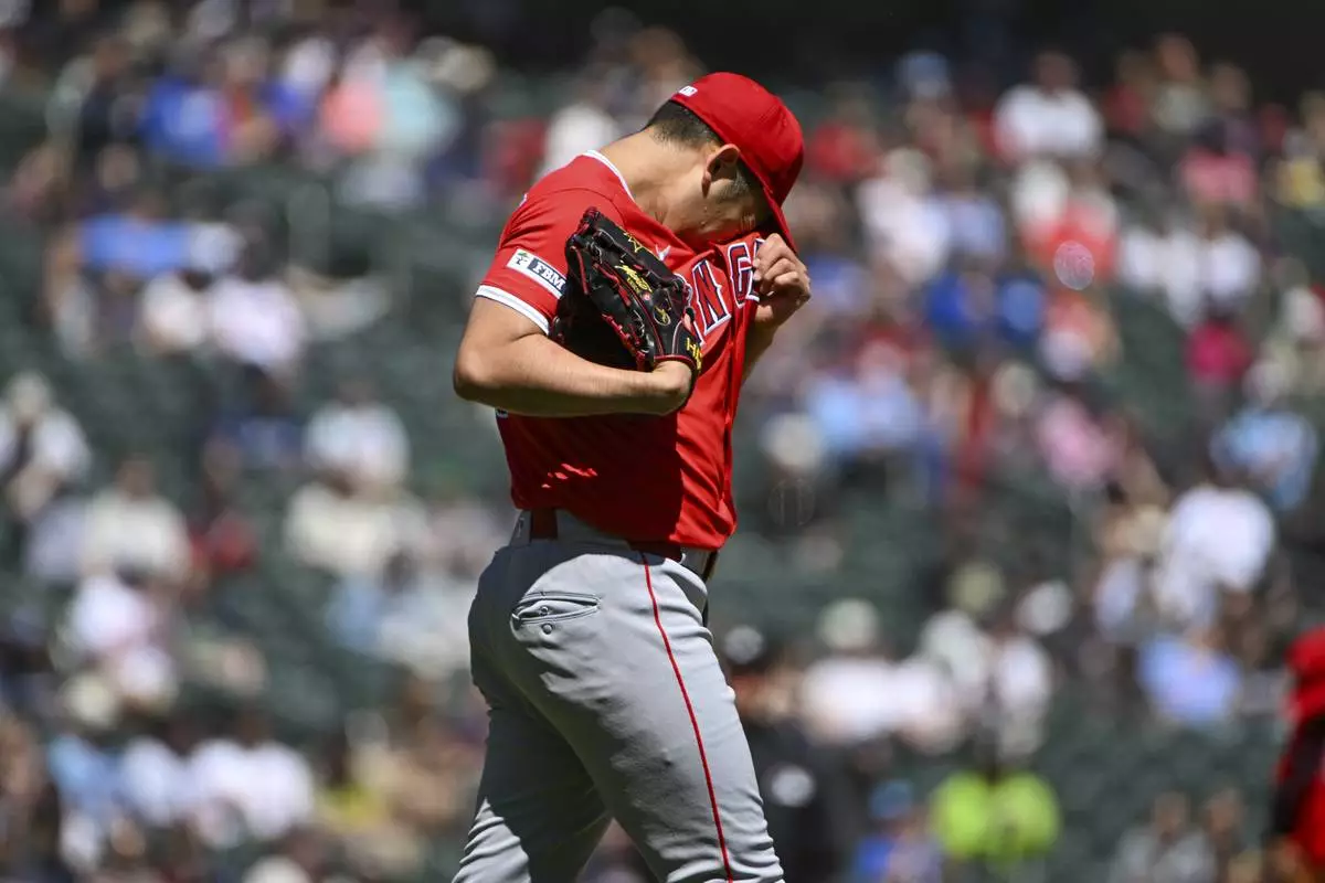 Los Angeles Angels pitcher Yusei Kikuchi wipes his face after giving up a walk to Minnesota Twins' Harrison Bader during the first inning of a baseball game, Saturday, April 26, 2025, in Minneapolis. (AP Photo/Craig Lassig)