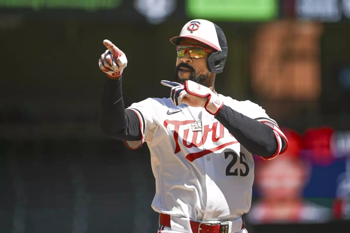 Minnesota Twins' Byron Buxton celebrates after scoring on a Ty France single of Los Angeles Angels pitcher Yusei Kikuchi during the first inning of a baseball game, Saturday, April 26, 2025, in Minneapolis. (AP Photo/Craig Lassig)