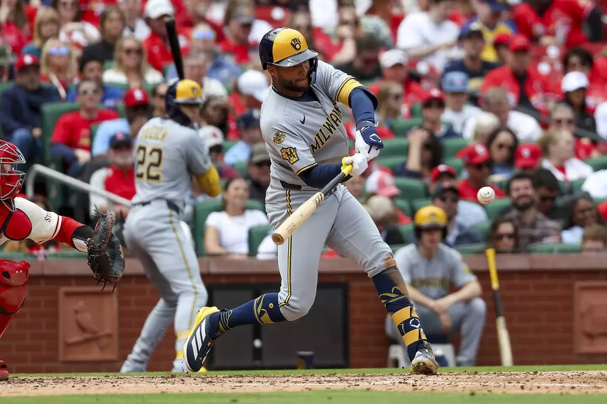 Milwaukee Brewers' Jackson Chourio hits an RBI double during the fifth inning of a baseball game against the St. Louis Cardinals Saturday, April 26, 2025, in St. Louis. (AP Photo/Scott Kane)
