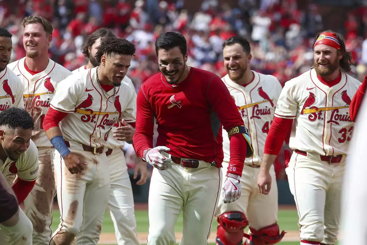 St. Louis Cardinals' Nolan Arenado, center, runs from teammates as they celebrate after his walkoff solo home run during the ninth inning of a baseball game against the Milwaukee Brewers, Saturday, April 26, 2025, in St. Louis. (AP Photo/Scott Kane)