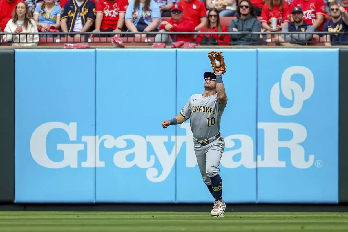 Milwaukee Brewers' Sal Frelick catches a fly ball hit by St. Louis Cardinals' Nolan Arenado during the fourth inning of a baseball game Saturday, April 26, 2025, in St. Louis. (AP Photo/Scott Kane)