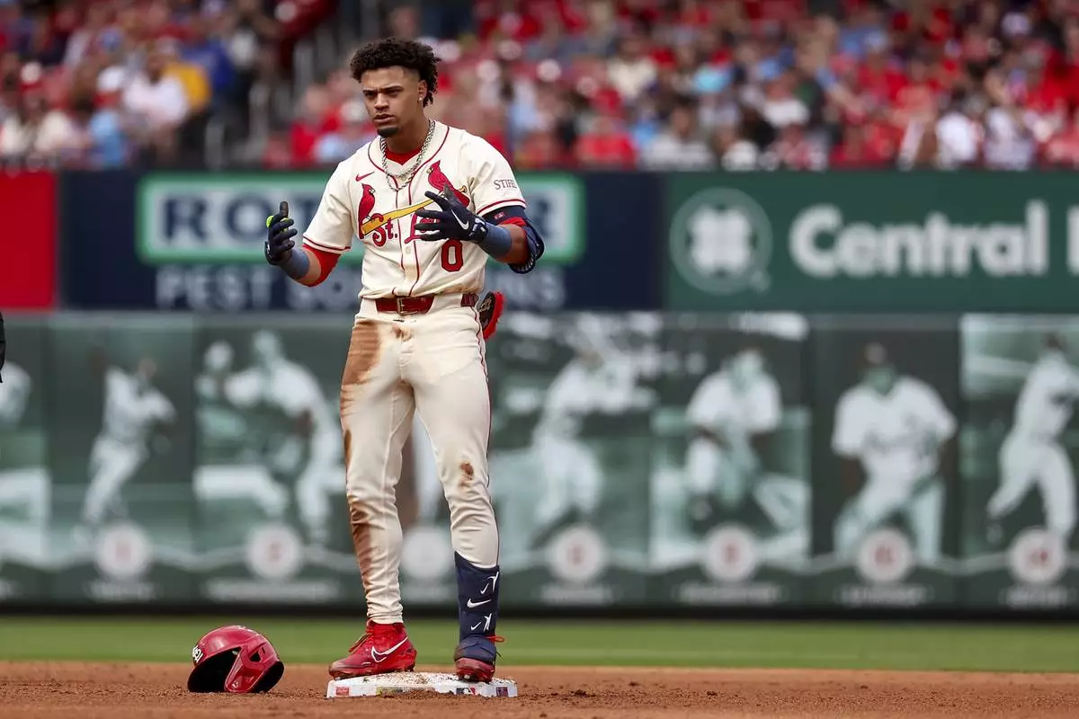 St. Louis Cardinals' Masyn Winn reacts after hitting a double during the fourth inning of a baseball game against the Milwaukee Brewers, Saturday, April 26, 2025, in St. Louis. (AP Photo/Scott Kane)