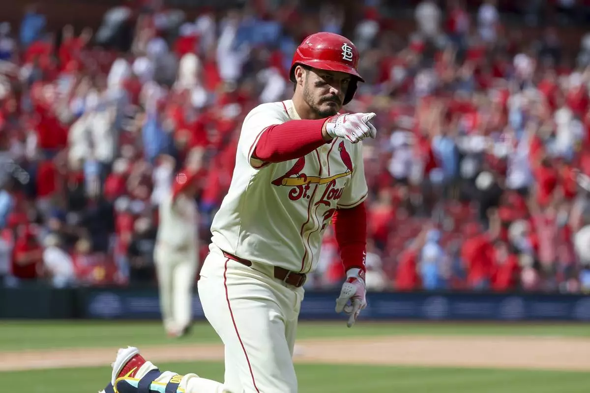 St. Louis Cardinals' Nolan Arenado points to the dugout as he runs the bases after hitting a walk-off solo home run during the ninth inning of a baseball game against the Milwaukee Brewers Saturday, April 26, 2025, in St. Louis. (AP Photo/Scott Kane)