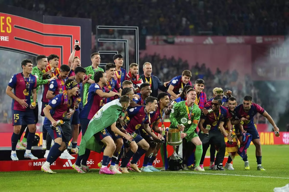 Barcelona players celebrate their victory at the Spanish Copa del Rey final soccer match between Barcelona and Real Madrid at Estadio de La Cartuja stadium in Seville, Spain, Saturday, April 26, 2025. (AP Photo/Jose Breton)