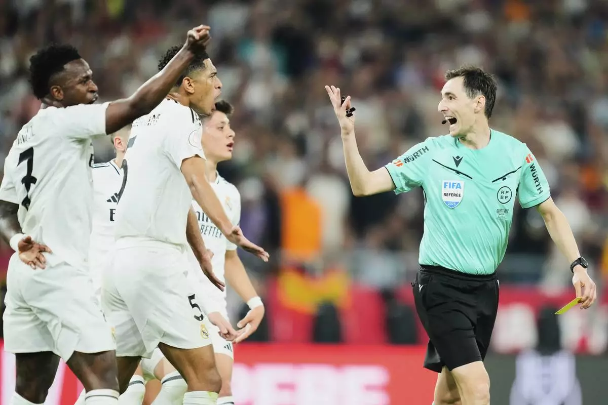 Real Madrid players argue with referee Ricardo De Burgos Bengoetxea, right, during the Spanish Copa del Rey final soccer match between Barcelona and Real Madrid at Estadio de La Cartuja stadium in Seville, Spain, Saturday, April 26, 2025. (AP Photo/Jose Breton)