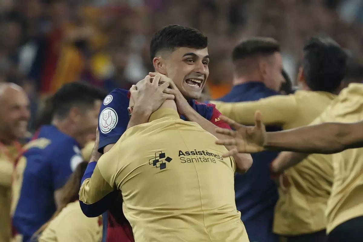 Barcelona's Pedri celebrates winning the Spanish Copa del Rey final soccer match between Barcelona and Real Madrid at Estadio de La Cartuja stadium in Seville, Spain, Sunday, April 27, 2025. (AP Photo/Joan Monfort)