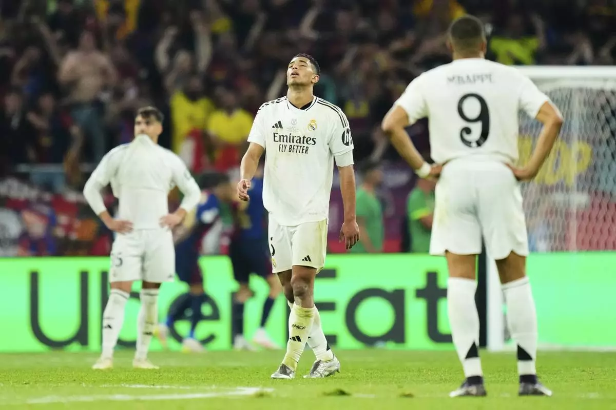 Real Madrid's Jude Bellingham, centre, reacts disappointed after the Spanish Copa del Rey final soccer match between Barcelona and Real Madrid at Estadio de La Cartuja stadium in Seville, Spain, Saturday, April 26, 2025. (AP Photo/Jose Breton)
