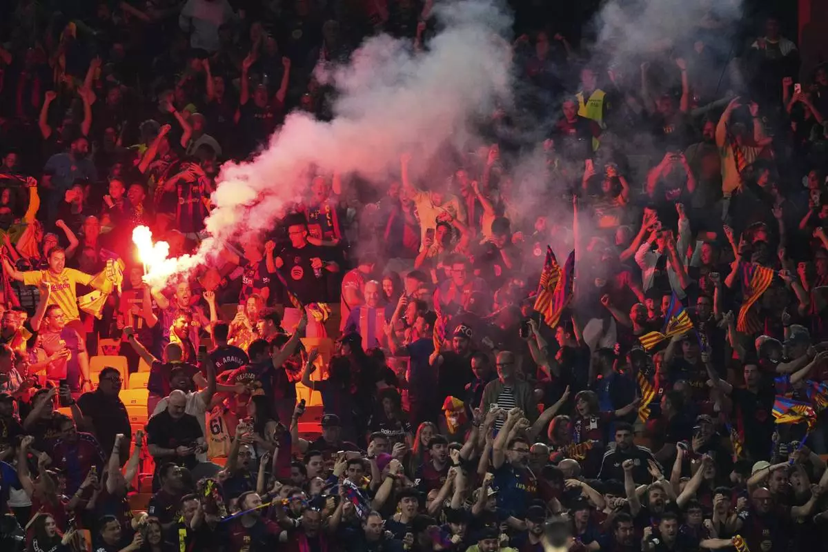 Fans light flares on the stands during the Spanish Copa del Rey final soccer match between Barcelona and Real Madrid at Estadio de La Cartuja stadium in Seville, Spain, Saturday, April 26, 2025. (AP Photo/Jose Breton)