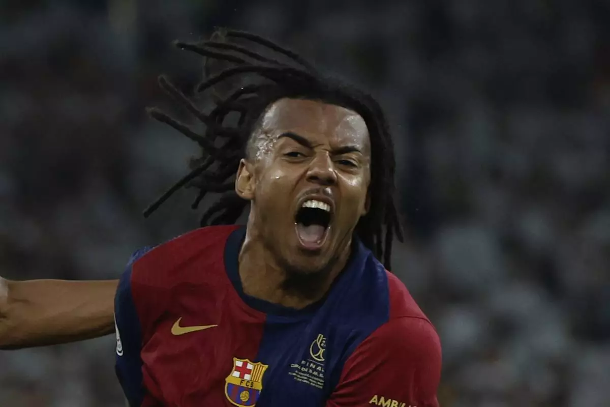 Barcelona's Jules Kounde celebrates after scoring his side's third goal during the Spanish Copa del Rey final soccer match between Barcelona and Real Madrid at Estadio de La Cartuja stadium in Seville, Spain, Sunday, April 27, 2025. (AP Photo/Joan Monfort)