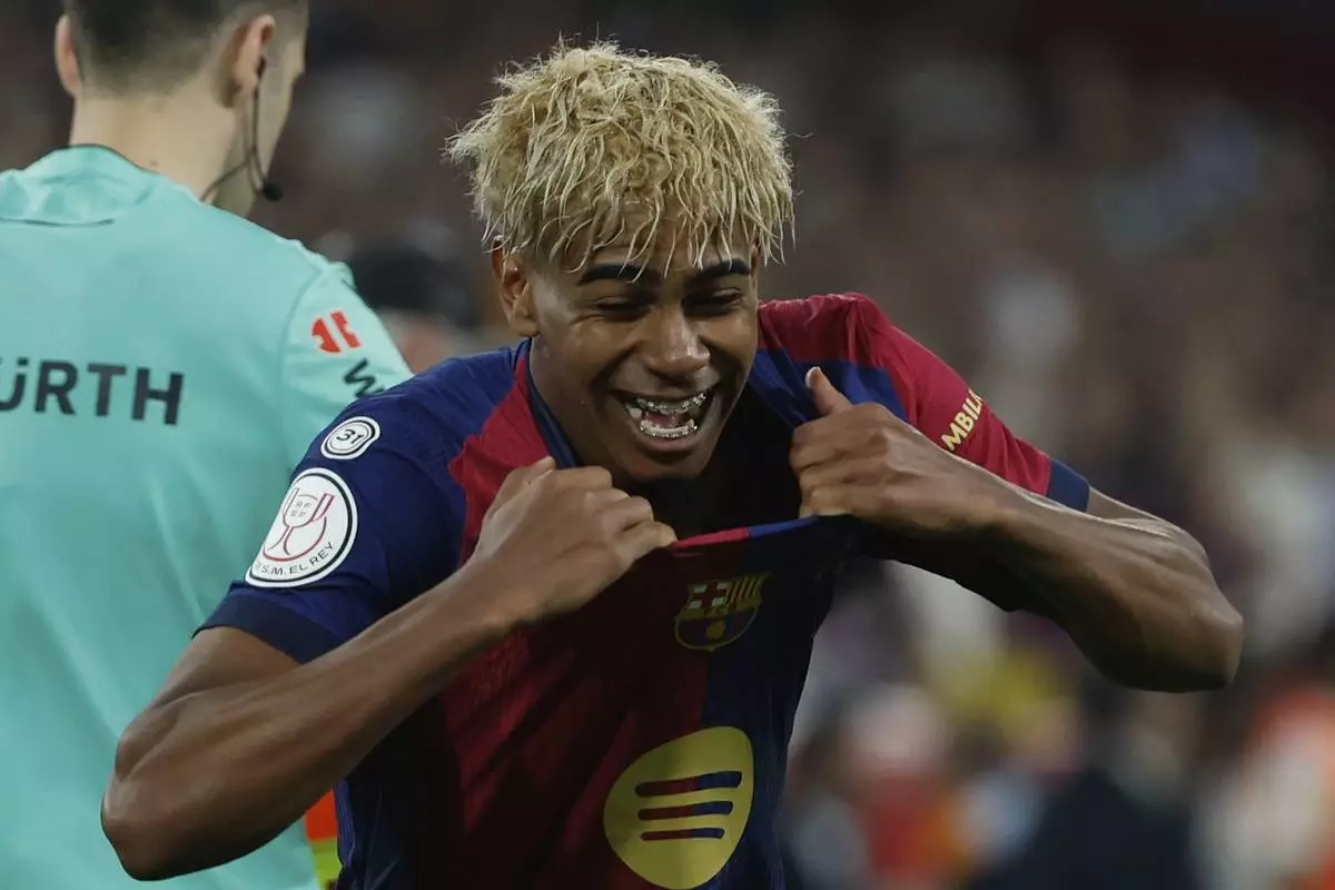 Barcelona's Lamine Yamal celebrates winning the Spanish Copa del Rey final soccer match between Barcelona and Real Madrid at Estadio de La Cartuja stadium in Seville, Spain, Sunday, April 27, 2025. (AP Photo/Joan Monfort)