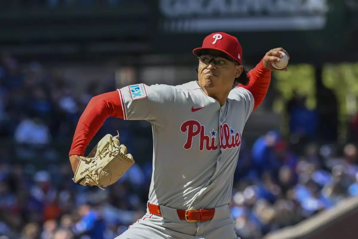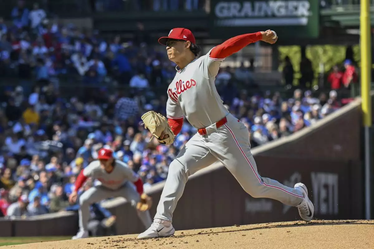 Philadelphia Phillies pitcher Jesús Luzardo delivers during the first inning of a baseball game against the Chicago Cubs, Saturday, April 26, 2025, in Chicago. (AP Photo/Matt Marton)