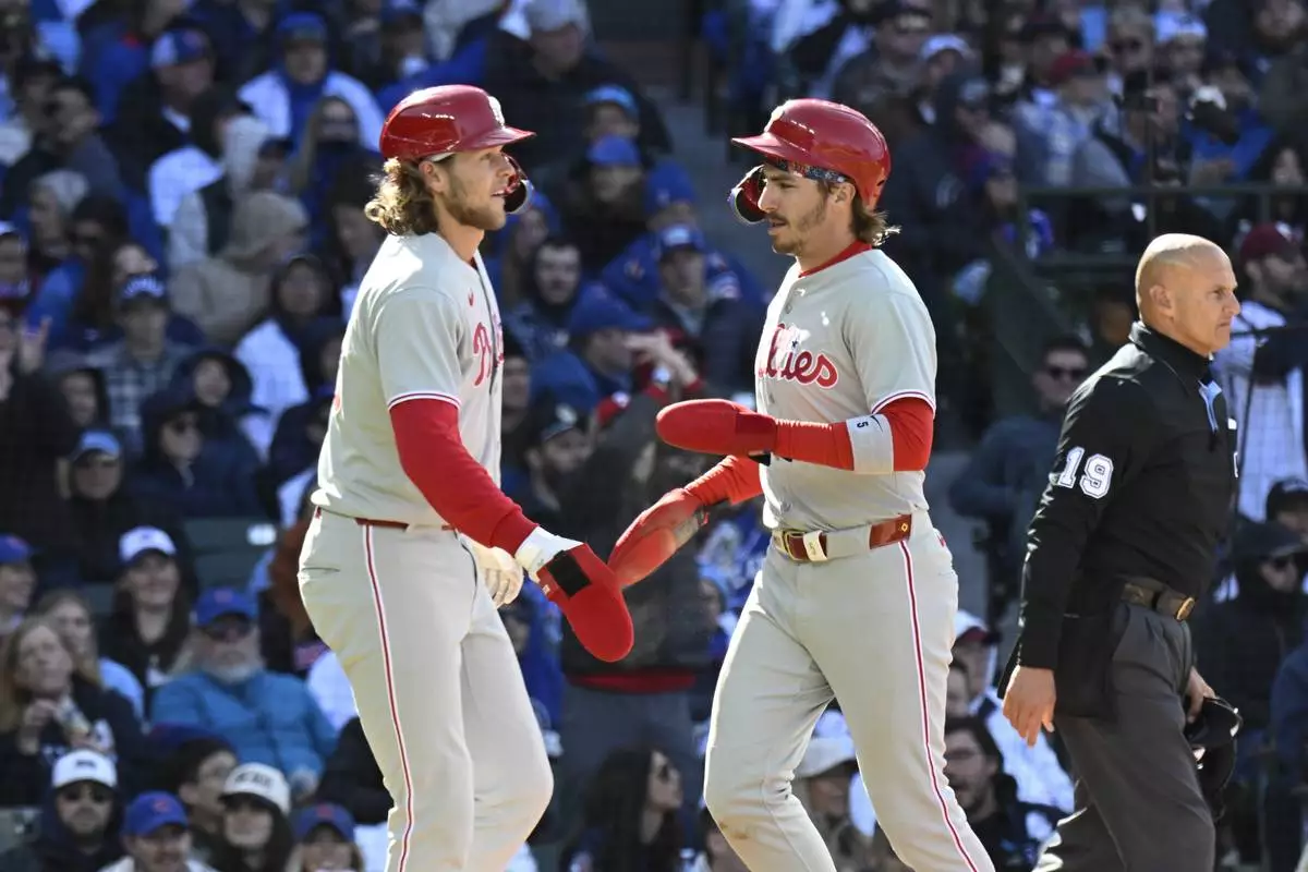 Philadelphia Phillies' Alec Bohm, left, and Bryson Stott high five after they score during the fourth inning of a baseball game against the Chicago Cubs, Saturday, April 26, 2025, in Chicago. (AP Photo/Matt Marton)