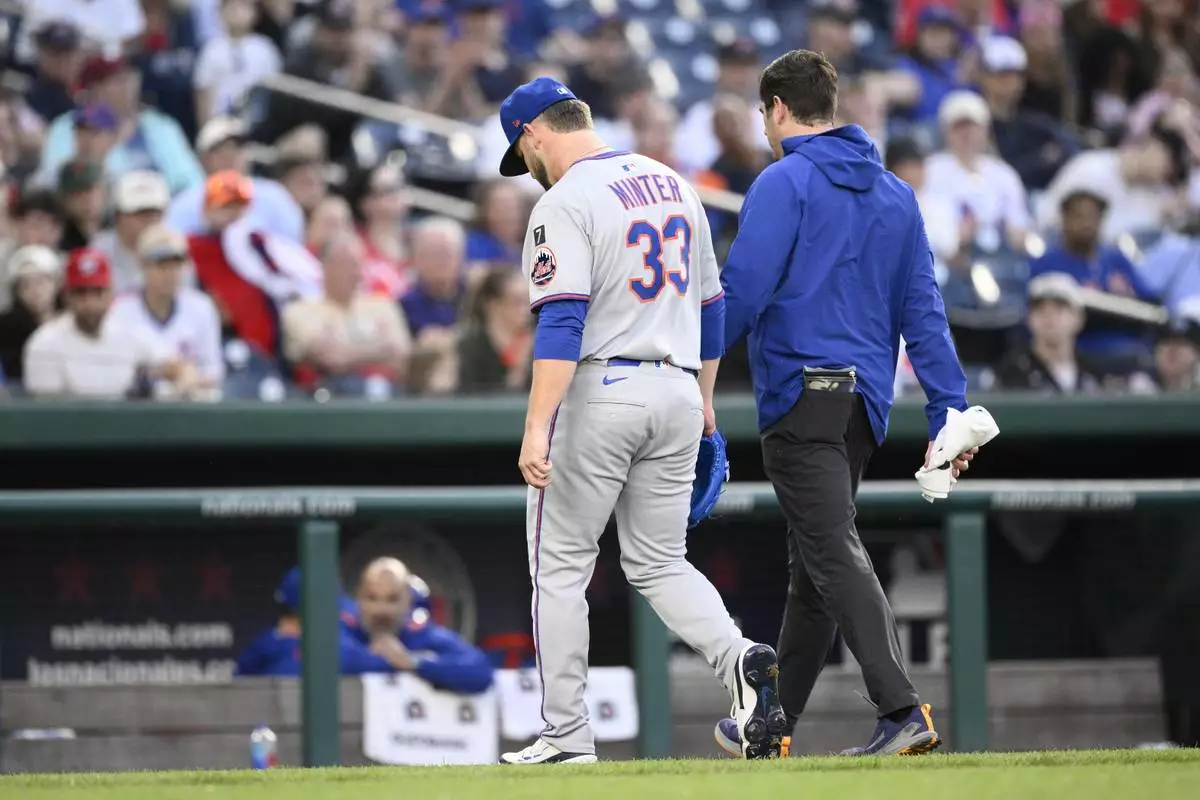 New York Mets relief pitcher A.J. Minter (33) leaves a baseball game with a trainer during the eighth inning against the Washington Nationals, Saturday, April 26, 2025, in Washington. (AP Photo/Nick Wass)