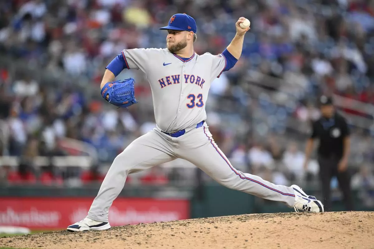 New York Mets relief pitcher A.J. Minter throws during the eighth inning of a baseball game against the Washington Nationals, Saturday, April 26, 2025, in Washington. (AP Photo/Nick Wass)