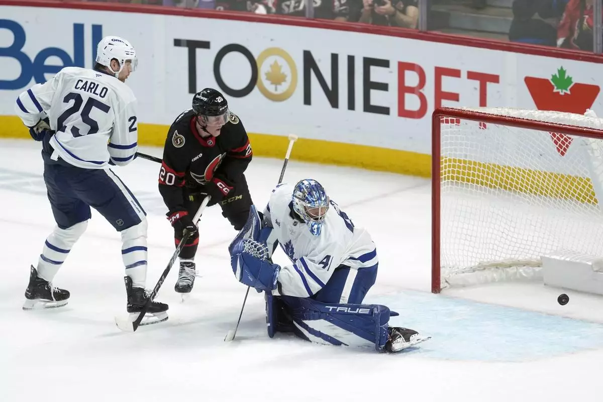 Ottawa Senators' Fabian Zetterlund (20) and Toronto Maple Leafs' Brandon Carlo (25) watch as the puck goes past Maple Leafs goaltender Anthony Stolarz (41) on a shot by Senators' Jake Sanderson (not shown) during overtime of Game 4 of an NHL hockey Stanley Cup first-round playoff series in Ottawa, Ontario, Saturday, April 26, 2025. (Adrian Wyld/The Canadian Press via AP)