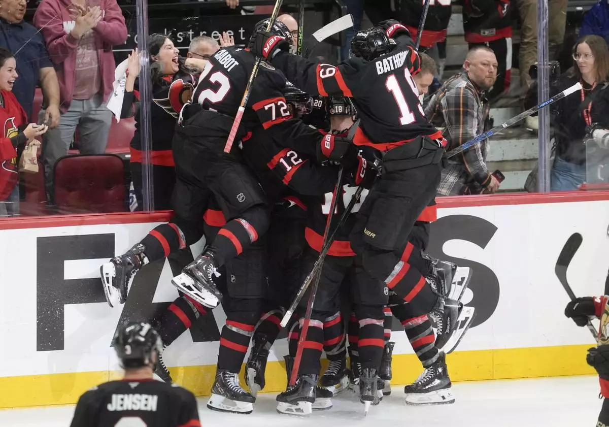 Members of the Ottawa Senators celebrate after defeating the Toronto Maple Leafs in overtime NHL playoff action in Ottawa, on Saturday, April 26, 2025. (Adrian Wyld/The Canadian Press via AP)