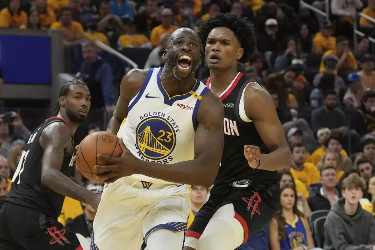 Golden State Warriors forward Draymond Green (23) drives to the basket against Houston Rockets forward Amen Thompson, right, during the first half of Game 3 of an NBA basketball first-round playoff series in San Francisco, Saturday, April 26, 2025. (AP Photo/Jeff Chiu)
