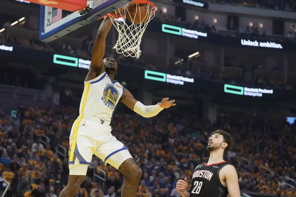 Golden State Warriors forward Jonathan Kuminga (00) dunks over Houston Rockets center Alperen Sengun (28) during the first half of Game 3 of an NBA basketball first-round playoff series in San Francisco, Saturday, April 26, 2025. (AP Photo/Jeff Chiu)