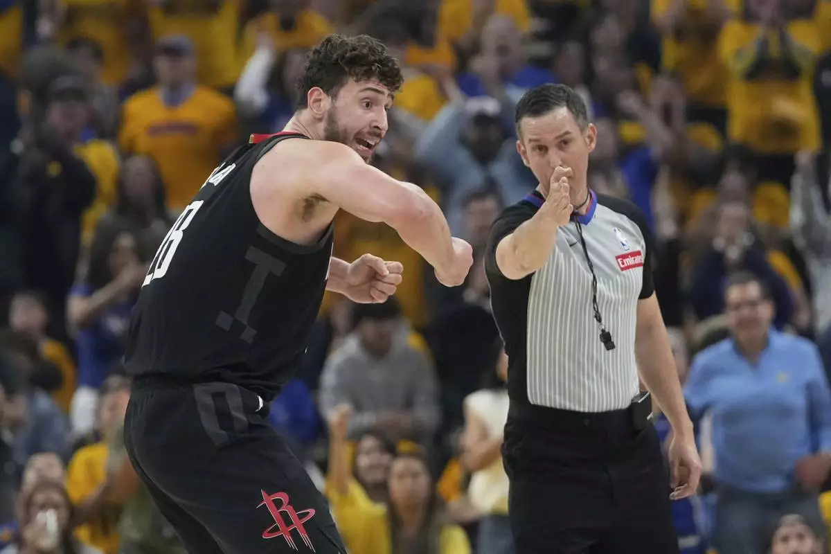 Houston Rockets center Alperen Sengun, left, reacts toward an official during the first half of Game 3 of an NBA basketball first-round playoff series against the Golden State Warriors in San Francisco, Saturday, April 26, 2025. (AP Photo/Jeff Chiu)
