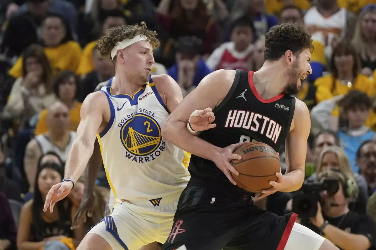 Houston Rockets center Alperen Sengun, right, drives to the basket against Golden State Warriors guard Brandin Podziemski (2) during the first half of Game 3 of an NBA basketball first-round playoff series in San Francisco, Saturday, April 26, 2025. (AP Photo/Jeff Chiu)