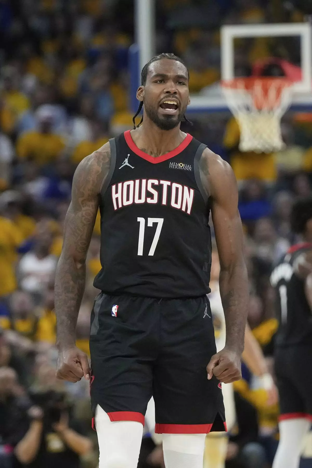 Houston Rockets forward Tari Eason (17) reacts after scoring against the Golden State Warriors during the first half of Game 3 of an NBA basketball first-round playoff series in San Francisco, Saturday, April 26, 2025. (AP Photo/Jeff Chiu)