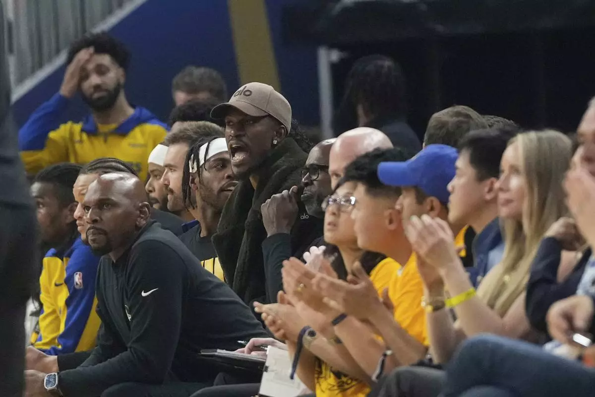 Injured Golden State Warriors forward Jimmy Butler III, middle, reacts from the bench during the first half of Game 3 of an NBA basketball first-round playoff series against the Houston Rockets in San Francisco, Saturday, April 26, 2025. (AP Photo/Jeff Chiu)