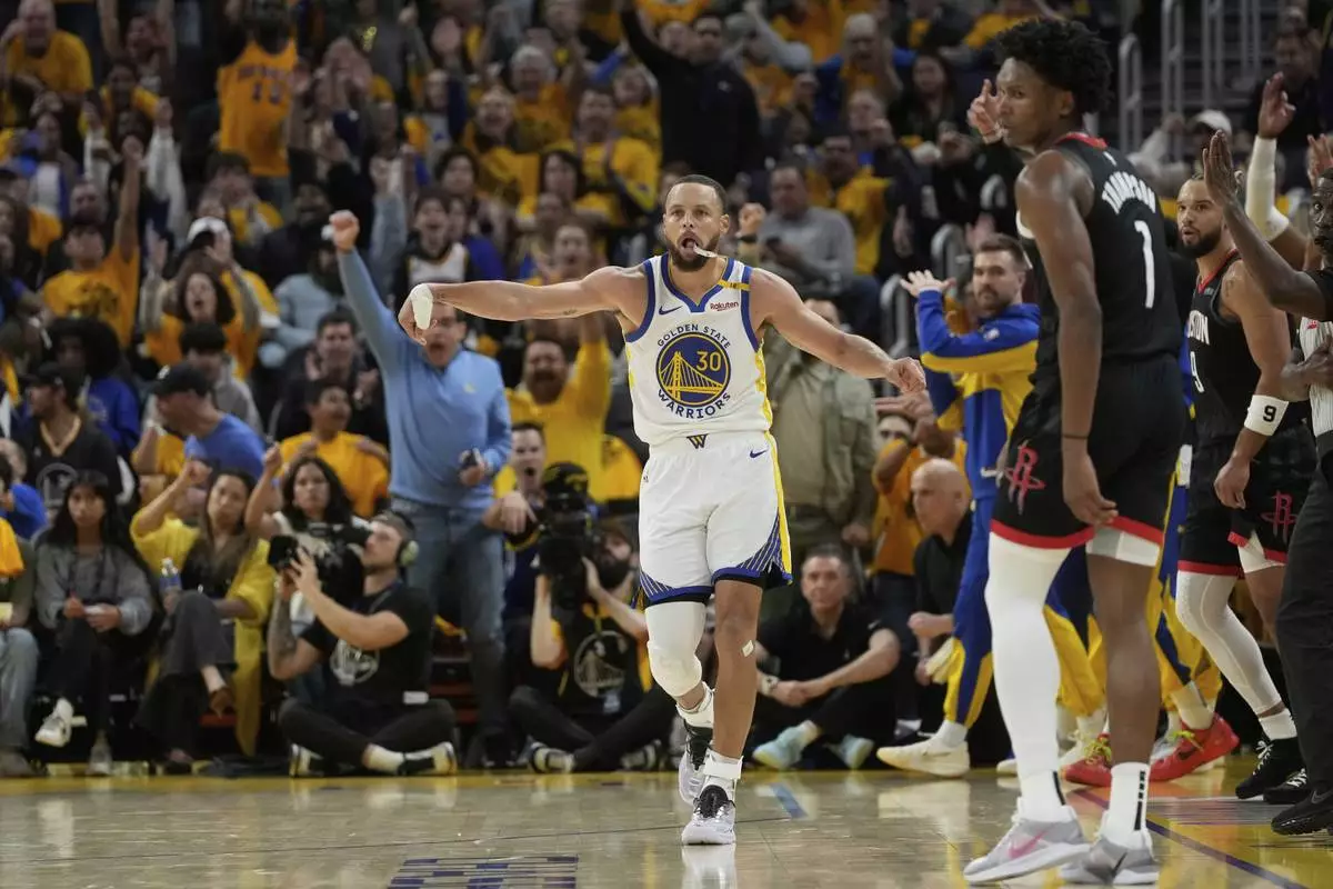 Golden State Warriors guard Stephen Curry (30) celebrates after making a 3-point basket during the second half of Game 3 of an NBA basketball first-round playoff series against the Houston Rockets in San Francisco, Saturday, April 26, 2025. (AP Photo/Jeff Chiu)