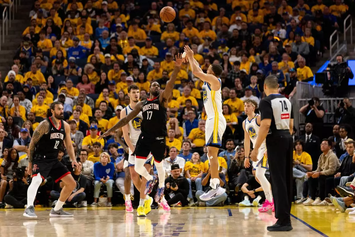 Golden State Warriors guard Stephen Curry (30) shoots against the Houston Rockets during the first half of Game 3 of an NBA basketball first-round playoff series in San Francisco, Saturday, April 26, 2025. (AP Photo/Jeff Chiu)