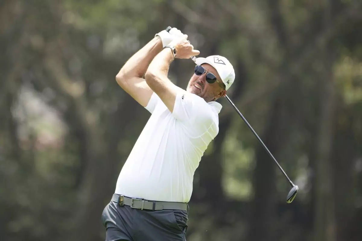 Captain Phil Mickelson, of HyFlyers GC, hits from the 12th tee during the second round of LIV Golf Mexico City at Club de Golf Chapultepec, Saturday, April 26, 2025, in Naucalpan, Mexico. (Charles Laberge/LIV Golf via AP)