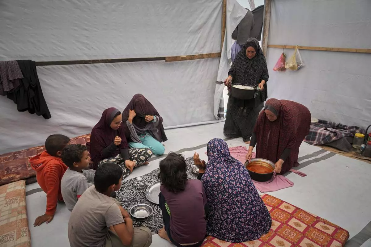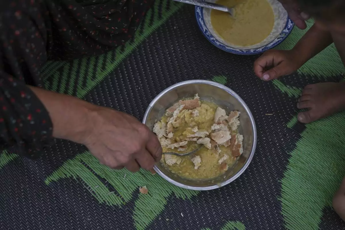 The Al-Najjar family eats peas with rice in their family tent in Muwasi, on the outskirts of Khan Younis in the southern Gaza Strip, Friday, April, 25, 2025(AP Photo/Abdel Kareem Hana)