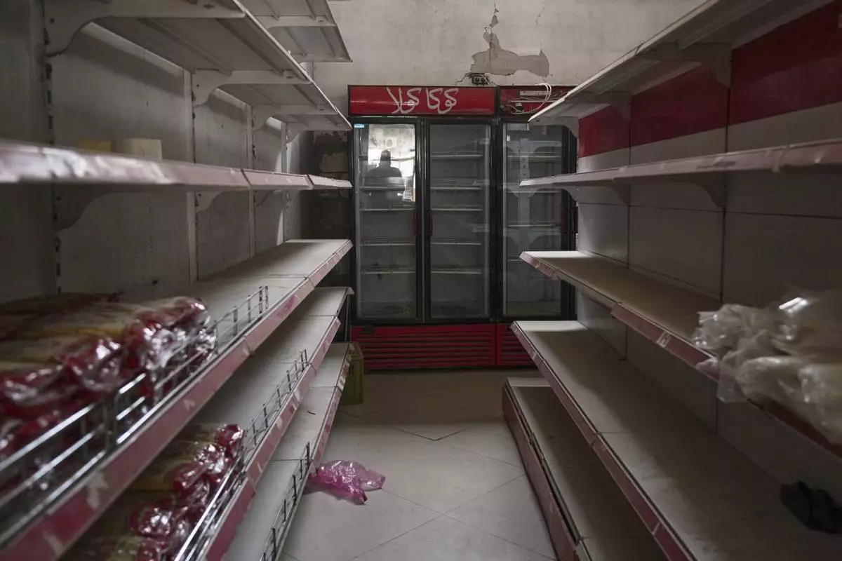 Empty shelves are seen at Al-Tayyibat supermarket in Khan Younis, in the southern Gaza Strip, Thursday, April 24, 2025, amid ongoing food shortages. (AP Photo/Abdel Kareem Hana)