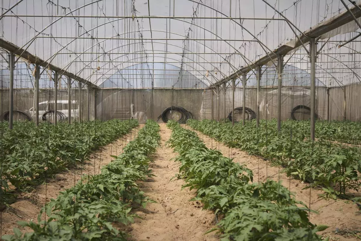 Tomato crops grow in a greenhouse in Khan Younis, in the southern Gaza Strip, Friday, April 25, 2025. (AP Photo/Abdel Kareem Hana)