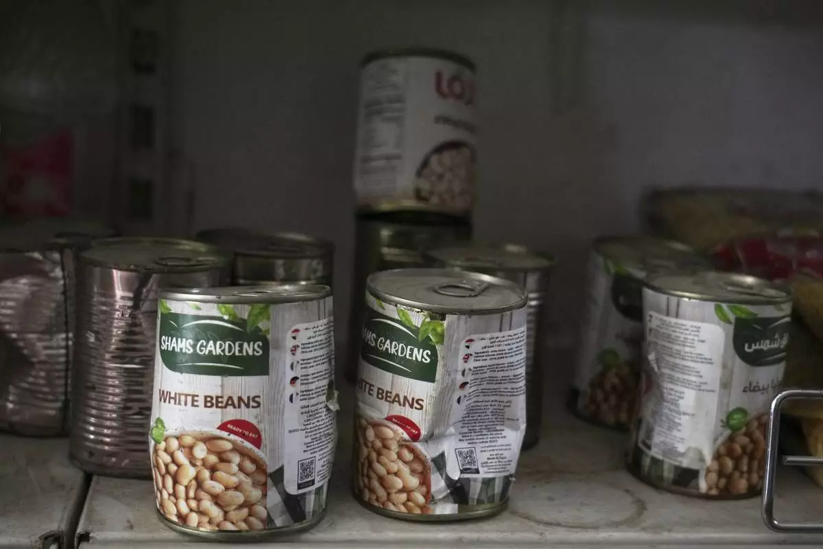 Damaged cans of white beans are displayed for sale on a shelf at Al-Tayebat supermarket in Khan Younis, in the southern Gaza Strip, Thursday, April 24, 2025. (AP Photo/Abdel Kareem Hana)