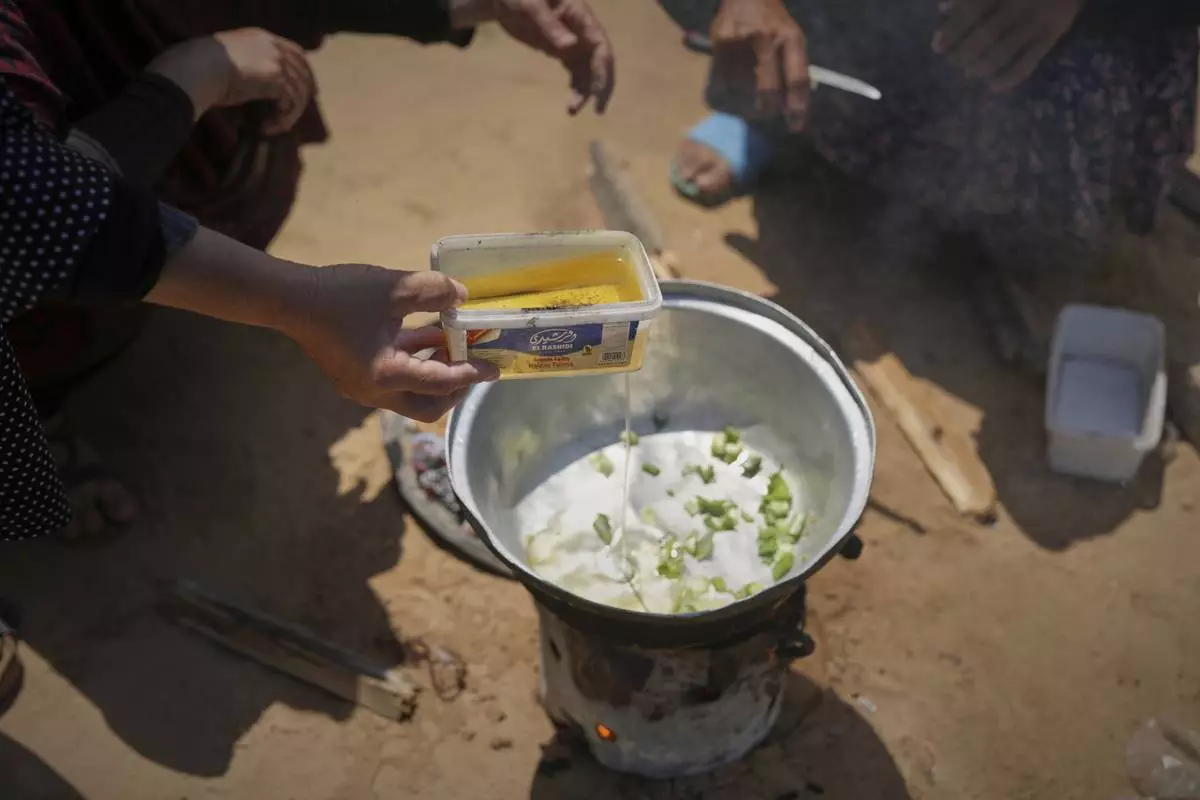 The Al-Najjar family prepares for a meal of peas with rice in their family tent in Muwasi, on the outskirts of Khan Younis in the southern Gaza Strip, Friday, April, 25, 2025(AP Photo/Abdel Kareem Hana)