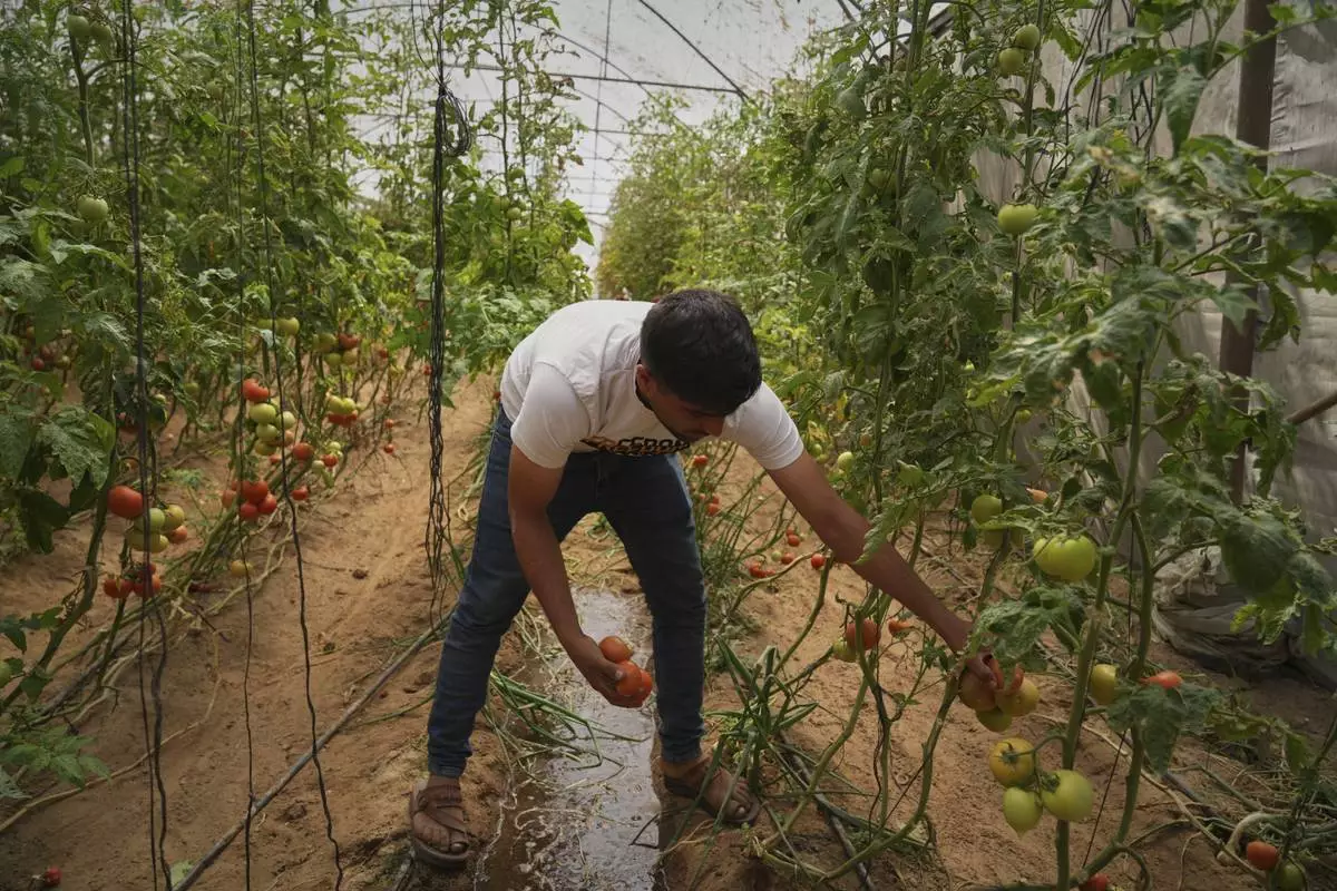 Farmer Mahmoud Al-Shaer picks tomatoes from crops growing in a greenhouse in Khan Younis, in the southern Gaza Strip, Friday, April 25, 2025. (AP Photo/Abdel Kareem Hana)