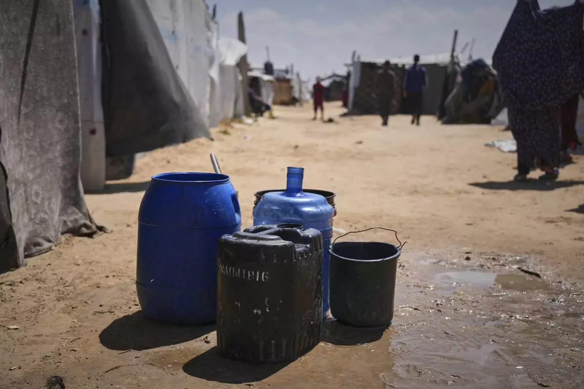 Empty water barrels are placed by the Al-Najjar family as they wait for the drinking water supplier to fill them in Muwasi, on the outskirts of Khan Younis in the southern Gaza Strip, Friday, April 25, 2025. (AP Photo/Abdel Kareem Hana)