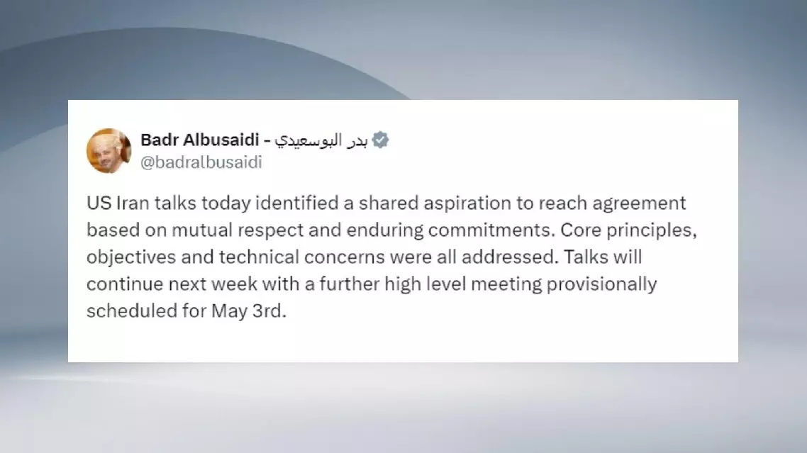In a statement issued on the social media platform X, Omani Foreign Minister Sayyid Badr bin Hamad bin Hamood Albusaidi said that "core principles, objectives, and technical concerns" were discussed thoroughly in the Omani-mediated talks, adding that negotiations are set to continue next week and that a further high-level meeting is provisionally scheduled for May 3.