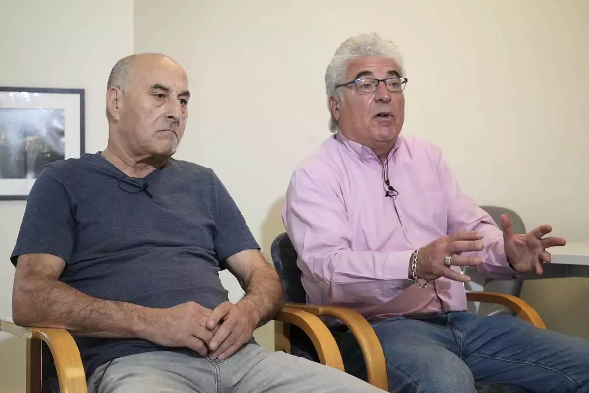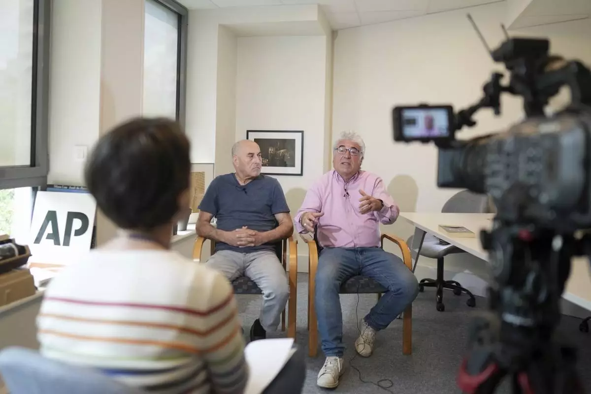 Yunice Abbas, left, one of the men accused in the 2016 armed robbery of Kim Kardashian and Thierry Niemen, co-author of the book "I Sequestered Kim Kardashian", answer the Associated Press, Tuesday, April 22, 2025 in Paris. (AP Photo/Thibault Camus)