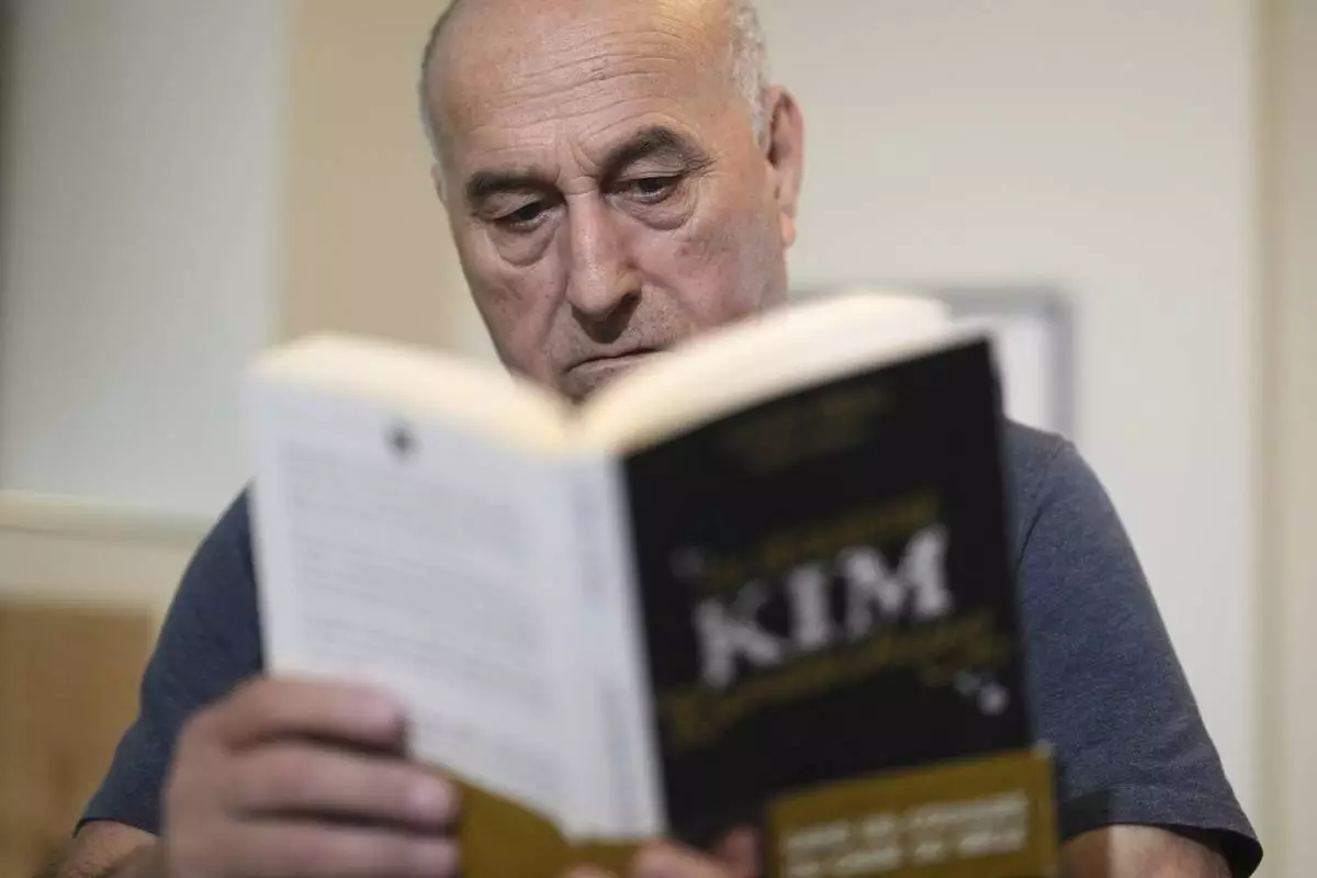 Yunice Abbas, one of the men accused in the 2016 armed robbery of Kim Kardashian , reads the book "I Sequestered Kim Kardashian" during an interview with the Associated Press, Tuesday, April 22, 2025 in Paris. (AP Photo/Thibault Camus)