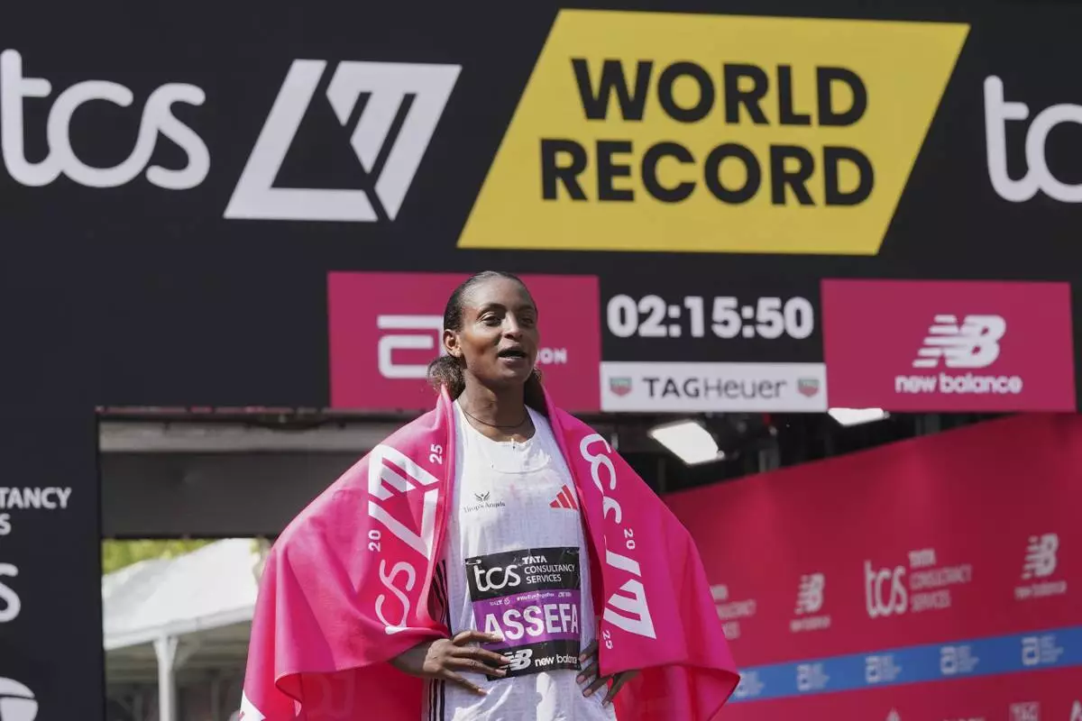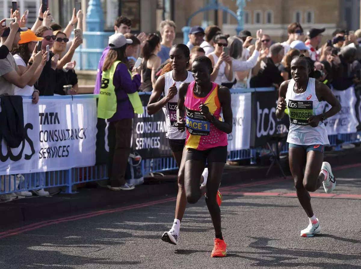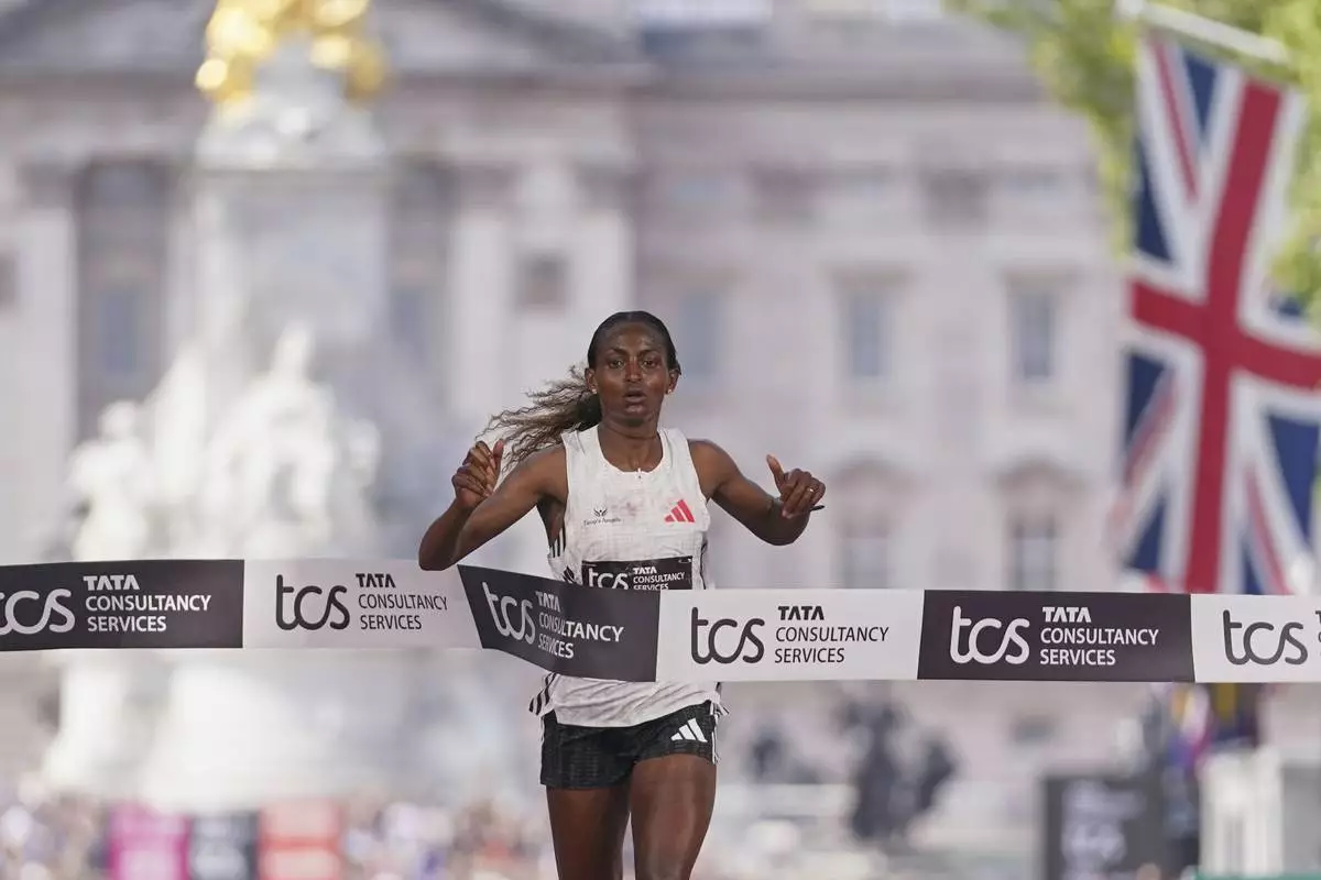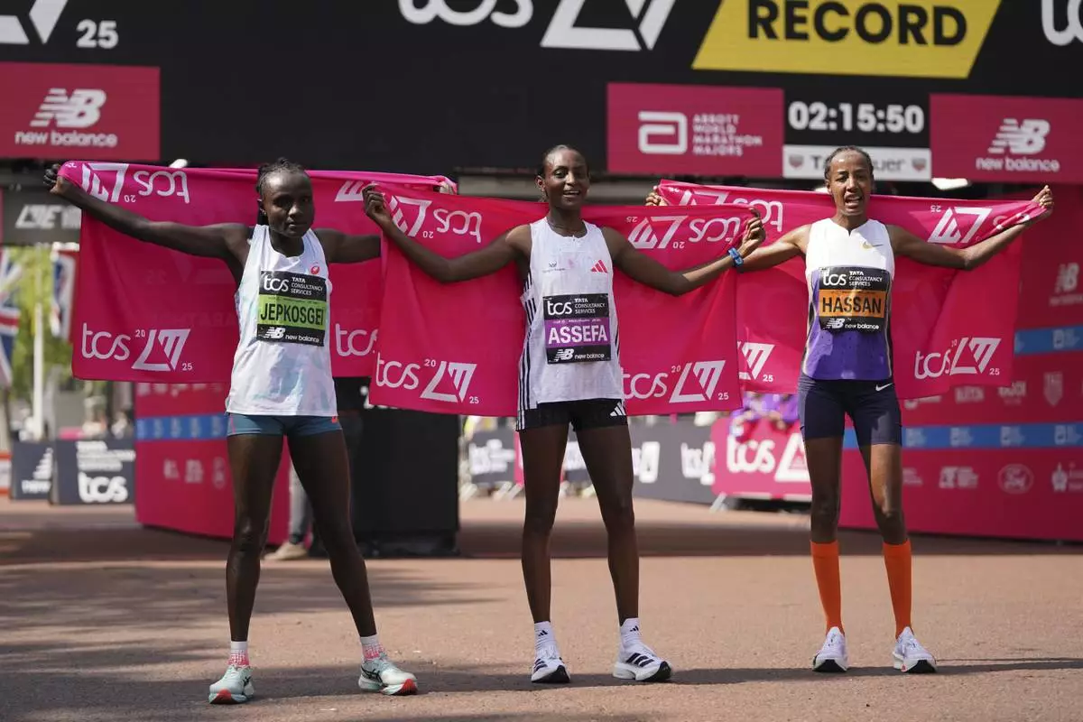 LONDON (AP) — Tigst Assefa of Ethiopia took advantage of the warm weather to pull away late for her first London Marathon title on Sunday, setting a record time for a women's-only race in the process.