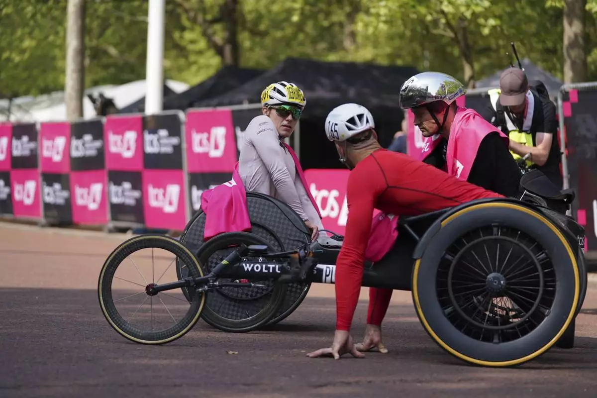 Marcel Hug of Switzerland, right, winner of the men's wheelchair race and Jetze Plat of the Netherland's who placed third in the men's race speak to Catherine Debrunner of Switzerland who won the women's wheelchair race near the finish line at the London Marathon, Sunday, April 27, 2025. (AP Photo/Alberto Pezzali)