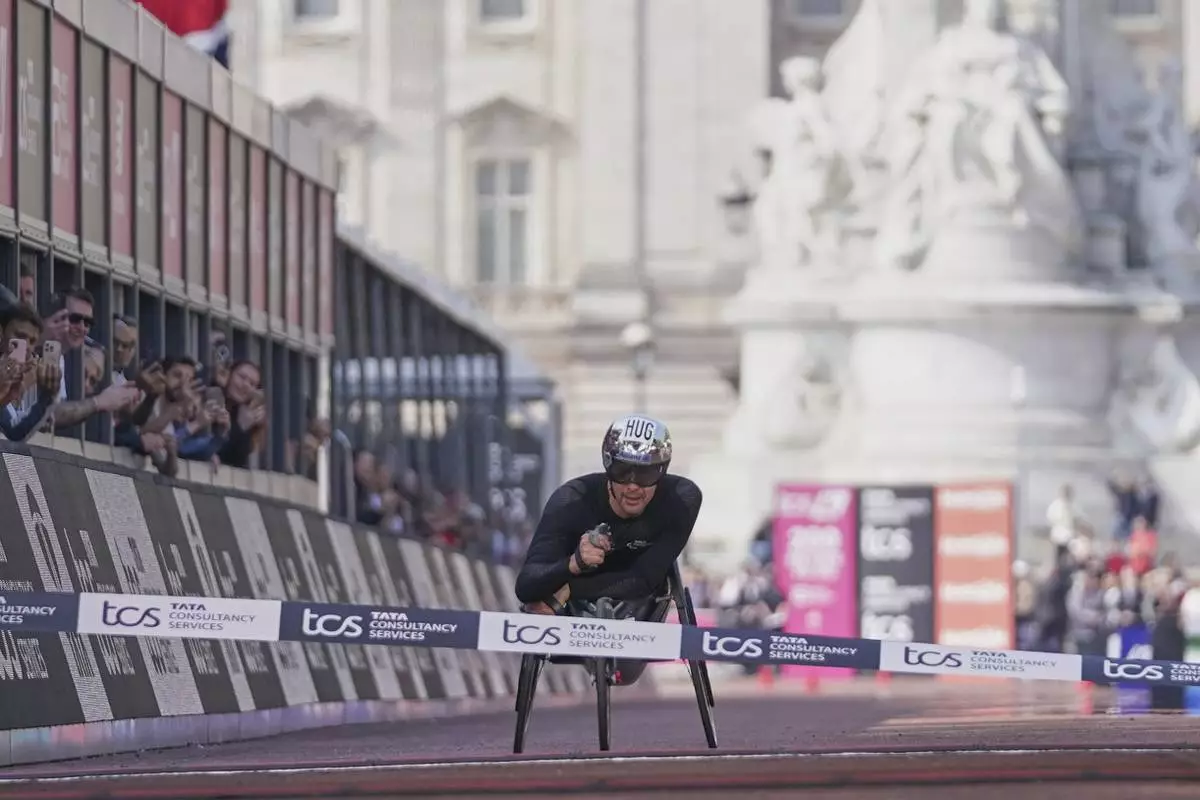 Marcel Hug of Switzerland crosses the line to win the men's wheelchair marathon at the London Marathon, Sunday, April 27, 2025. (AP Photo/Alberto Pezzali)